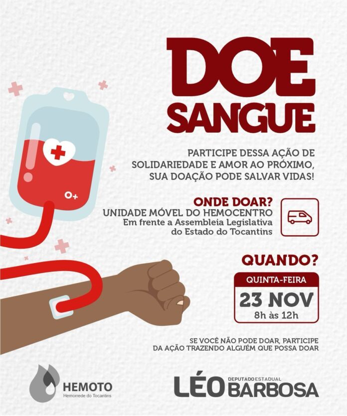 Na próxima quinta-feira, dia 23, das 08h às 12h, a unidade móvel do Hemocentro Palmas estará na frente da sede da Assembleia Legislativa do Tocantins (Aleto) para a realização de coletas de sangue. A ação atende a um requerimento do deputado estadual Léo Barbosa (Republicanos) e será realizada em parceria com o gabinete do parlamentar, a Diretoria de Saúde da Casa de Leis e o Hemocentro Palmas.