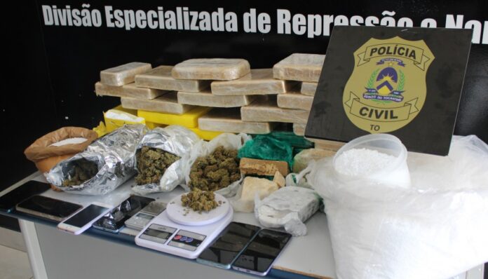 A equipe da Divisão de Repressão a Narcóticos fechou dois centros de distribuição de drogas, localizados na região Sul de Palmas, que resultaram na prisão de duas pessoas investigadas pelo crime de tráfico de drogas e na apreensão de cerca de 30 kg de entorpecentes, sendo 20kg de crack, 10kg de cocaína, 1,5kg de skank, mais de 10kg de ácido bórico, balança de precisão e celulares.