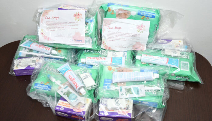 Os kits contém escova de dente, creme dental, pomada para assaduras, sabonete glicerinado e lenços umedecidos, que serão entregues principalmente às mulheres mais carentes, atendidas pelo setor de assistência social da unidade hospialar.