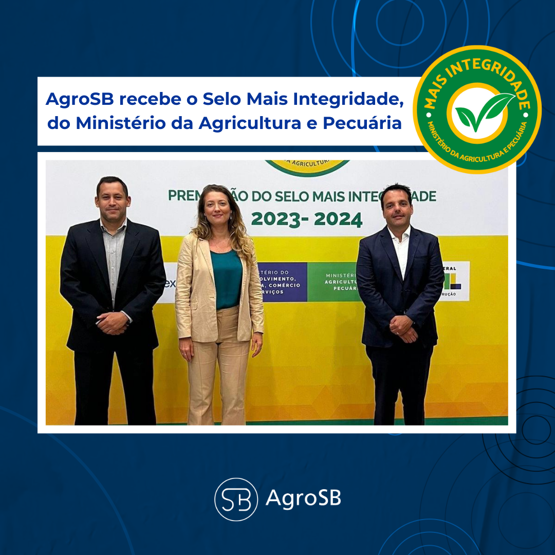Em cerimônia realizada em Brasília nesta quinta-feira, 21 de março, a AgroSB recebeu o Selo Mais Integridade – Verde. Esse reconhecimento é uma iniciativa do Ministério da Agricultura e Pecuária que busca valorizar e premiar organizações e cooperativas do agronegócio que desenvolvem boas práticas de integridade com enfoque na responsabilidade social, sustentabilidade ambiental e ética. Estiveram presentes na cerimônia representando a AgroSB o Diretor Presidente, Cristiano Soares, a Diretora Jurídica e de Sustentabilidade, Juliana Corrêa, e o Gerente de Auditoria e Integridade, André Medina.
