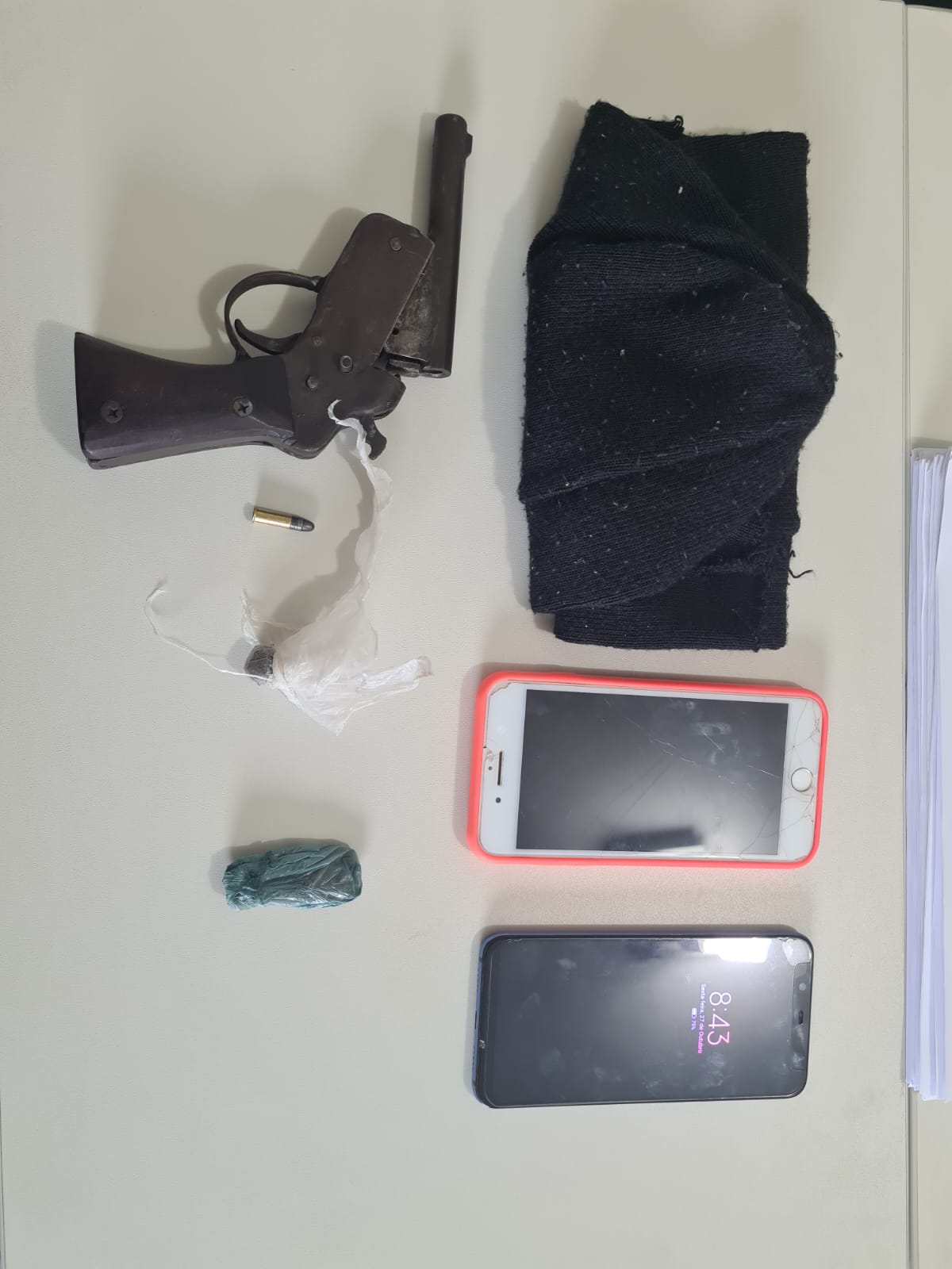 Durante o cumprimento das ordens judiciais, foram encontrados em poder do maior preso uma arma de fogo tipo pistola e uma porção de maconha. Já na casa de um dos adolescentes, os policiais civis localizaram e apreenderam uma porção de maconha. O segundo homem, maior de idade e também envolvido no crime ainda não foi localizado e encontra-se foragido.