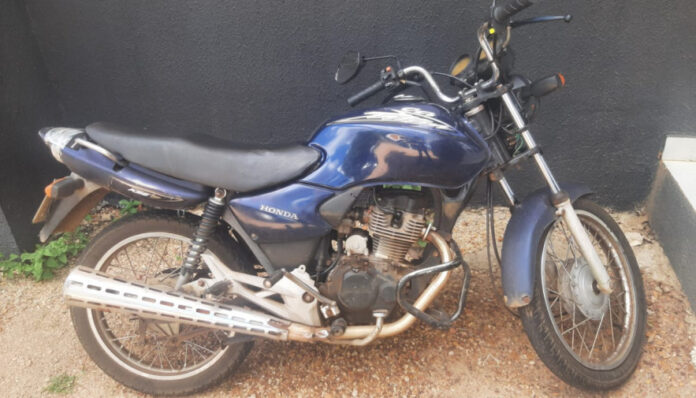 Após as orientações à vítima, os policiais iniciaram as buscas ao veículo por meio de consulta aos elementos identificadores e constataram que o veículo em questão, uma CG Titan Ks 125 azul, possuía restrição de furto/roubo.