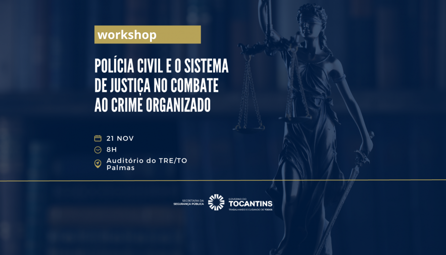 A Secretaria da Segurança Pública do Tocantins (SSP/TO), por meio da Escola Superior de Polícia (Espol), promove nesta terça-feira, 21, o workshop “A Polícia Civil e o Sistema de Justiça no Combate ao Crime Organizado”. O evento acontece em Palmas, no auditório do Tribunal Regional Eleitoral (TRE) , a partir das 8 horas.
