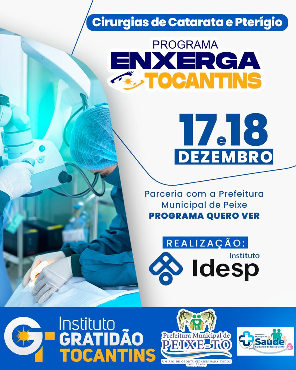 Em uma iniciativa visionária, o Instituto Gratidão Tocantins, idealizado pelo Deputado Estadual Gutierres Torquato, está promovendo o programa “Enxerga Tocantins.” Esta ação tem como objetivo realizar cirurgias de catarata e pterígio em vários municípios do Tocantins. Uma etapa de triagem já foi realizada em Gurupi e nesta segunda fase tem início as cirurgias, que serão realizadas no município de Peixe, nos dias 17 e 18 de dezembro, impactando positivamente a saúde ocular da comunidade local.