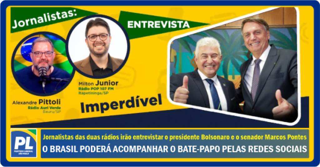 São Paulo – O presidente de Honra do PL, Jair Bolsonaro, e o senador Astronauta Marcos Pontes (PL-SP) serão entrevistados pelos jornalistas Alexandre Pittoli, da rádio Auri Verde de Bauru, e Milton Junior, da rádio POP 107 FM, de Itapetininga.