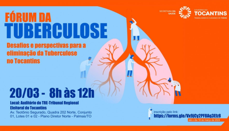 Com objetivo de reforçar ações de combate à tuberculose, a Secretaria de Estado da Saúde do Tocantins (SES-TO) realizará no dia 20, das 8h às 12h, o Fórum da Tuberculose com o tema, ‘Desafios e perspectivas para a eliminação da Tuberculose no Tocantins’.