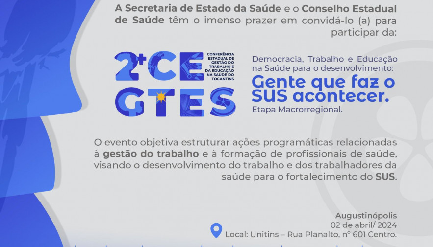 Os trabalhadores, gestores e conselheiros do Sistema Único de Saúde (SUS) tocantinense com interesse em discutir as atuais estruturas e possíveis melhorias para o serviço e atendimento ao usuário, podem participar no dia 02 de abril, da 1ª etapa macrorregional da Conferência Estadual de Gestão do Trabalho e da Educação na Saúde do Tocantins (2ª CEGTES-TO), em Augustinópolis.
