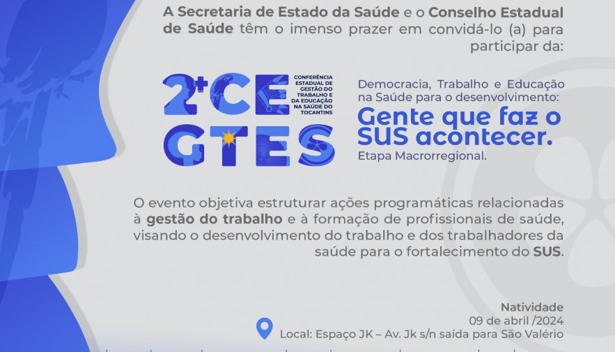 Com intuito de promover políticas públicas voltadas para a saúde, segurança e valorização dos trabalhadores, a Secretaria de Estado da Saúde do Tocantins (SES-TO) em parceria com o Conselho Estadual de Saúde e a Secretaria Municipal de Saúde, de Natividade realizará na terça-feira, 9, das 8h às 19h, a 3ª etapa macrorregional da 2ª Conferência Estadual de Gestão do Trabalho e da Educação na Saúde do Tocantins (2ª CEGTES). Deverão participar todos os 13 municípios que compõem a região de saúde Amor Perfeito.