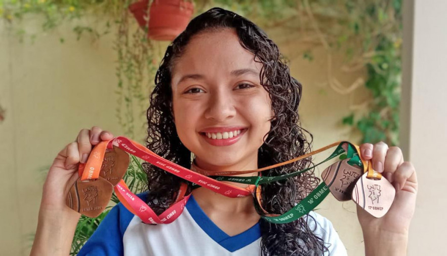 Uma das estudantes medalhista em 2023 é Maria Fernanda de Oliveira Milhomem, aluna da Escola do Campo Senador João Ribeiro, em Couto Magalhães, medalhista de ouro.