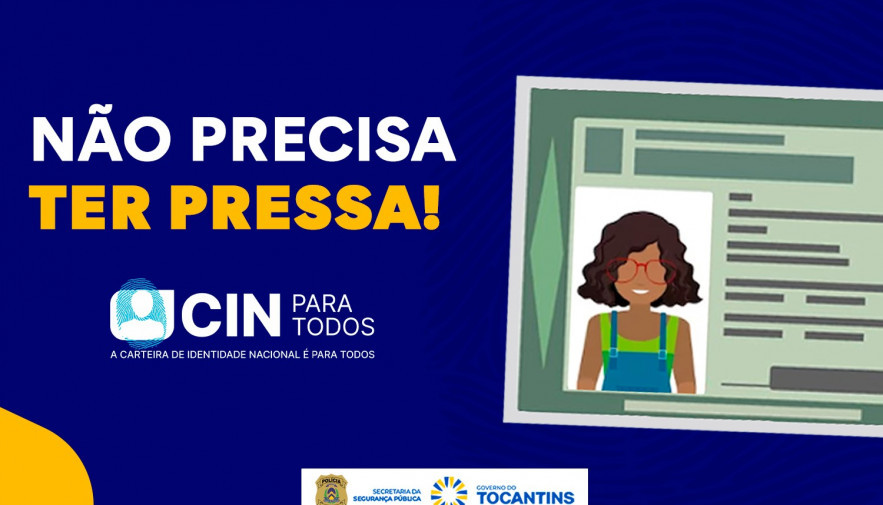 A Secretaria da Segurança Pública do Tocantins, por meio do Instituto de Identificação, reforça a população que não há necessidade de urgência para a confecção da nova Carteira de Identidade Nacional (CIN). Os cidadãos têm até 2032 para fazer a troca do RG pelo novo documento. Esse prazo é para que todo brasileiro tenha tempo de trocar o seu documento sem pressa.
