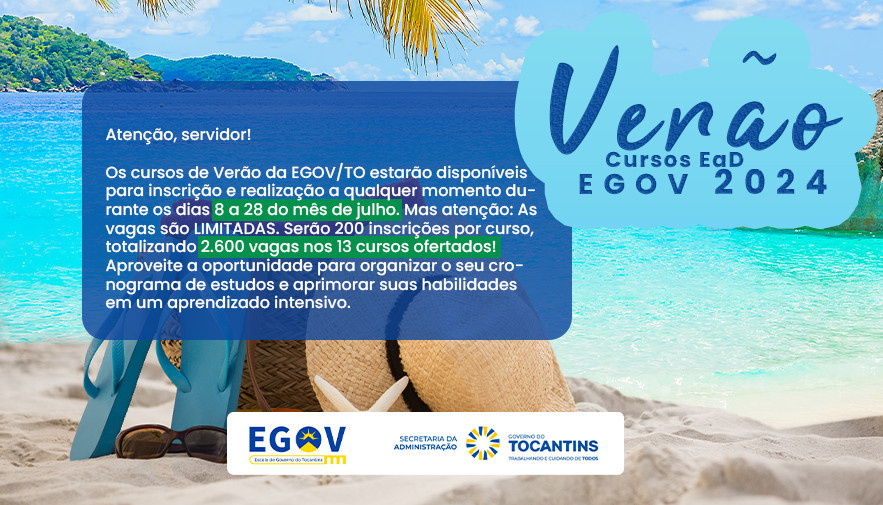 Em atenção à continuidade da qualificação profissional dos servidores tocantinenses, a Secretaria da Administração (Secad), por meio da Escola de Governo do Tocantins (Egov/TO), disponibiliza 13 cursos de Educação a Distância (EAD) durante o mês de julho. Os cursos contarão com uma programação diferenciada, permanecendo disponíveis para inscrição e realização a qualquer momento durante o período do dia 8 a 28 de julho deste ano. São ofertadas 200 inscrições por curso, totalizando 2,6 mil vagas. A carga horária varia entre 24 e 60 horas, de acordo com a capacitação escolhida e seus conteúdos programáticos.