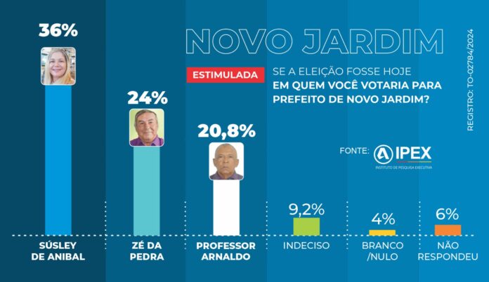 O Instituto de Pesquisa Executiva (IPEX) realizou uma pesquisa de intenção de votos no município de Novo Jardim, Tocantins, nos dias 20 e 21 de julho de 2024. A pesquisa está registrada na Justiça Eleitoral sob o número TO-02784/24 e ouviu 250 entrevistados. O nível de confiança da pesquisa é de 95% e a margem de erro é de 5,8 pontos percentuais para mais ou para menos.