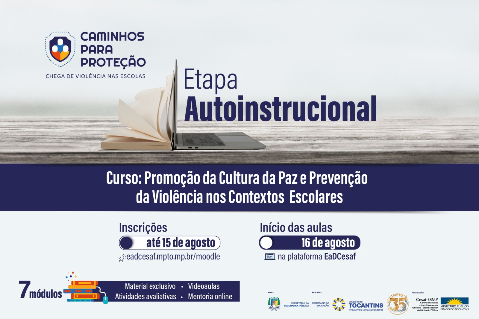 O Ministério Público do Tocantins (MPTO), por meio do Centro de Estudos e Aperfeiçoamento Funcional – Escola Superior do Ministério Público (Cesaf-ESMP) e em parceria com a Secretaria de Estado da Educação (Seduc), oferece o curso online e gratuito “Promoção da Cultura da Paz e Prevenção da Violência nos Contextos Escolares”, uma iniciativa voltada à construção de um ambiente escolar mais seguro e acolhedor. As inscrições estão abertas até o dia 15 de agosto, com início das aulas previsto para 16 de agosto.