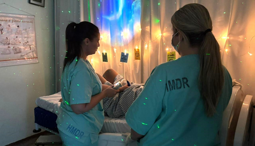 “A ambientação da sala de parto vai muito além da estética, ela contribui para o alívio de dor, menos estresse, também cria um espaço seguro para a mãe e o bebê. É muito mais do que um cuidado extra, é um ato de respeito, amor e acolhimento. Cromoterapia, musicoterapia e aromaterapia e apoio emocional são estratégias simples, mas muito poderosas. Essa experiência torna com certeza o trabalho de parto mais eficaz e agradável”, completou o enfermeiro residente em obstetrícia no HMDR, Mario Vitor Souza.